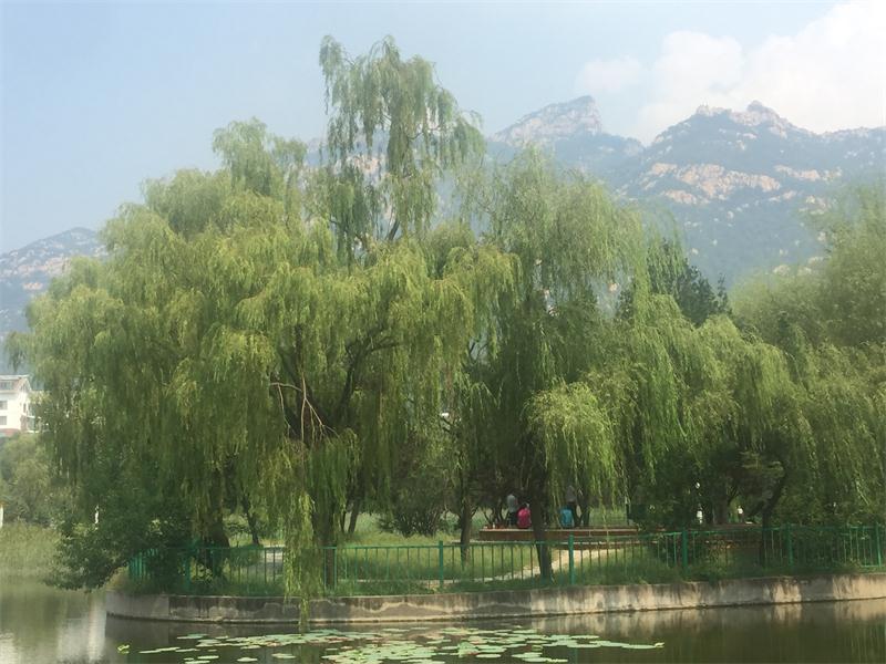 泰山廣場西側(cè)有一公園名曰御碑公園, 公園依山而建,園內(nèi)淺丘起伏,林木蔥郁,環(huán)境幽靜,根據(jù)高差,分為上下兩處水景,一棵棵柳樹倒映在水中,構(gòu)成了一幅美妙的畫卷。